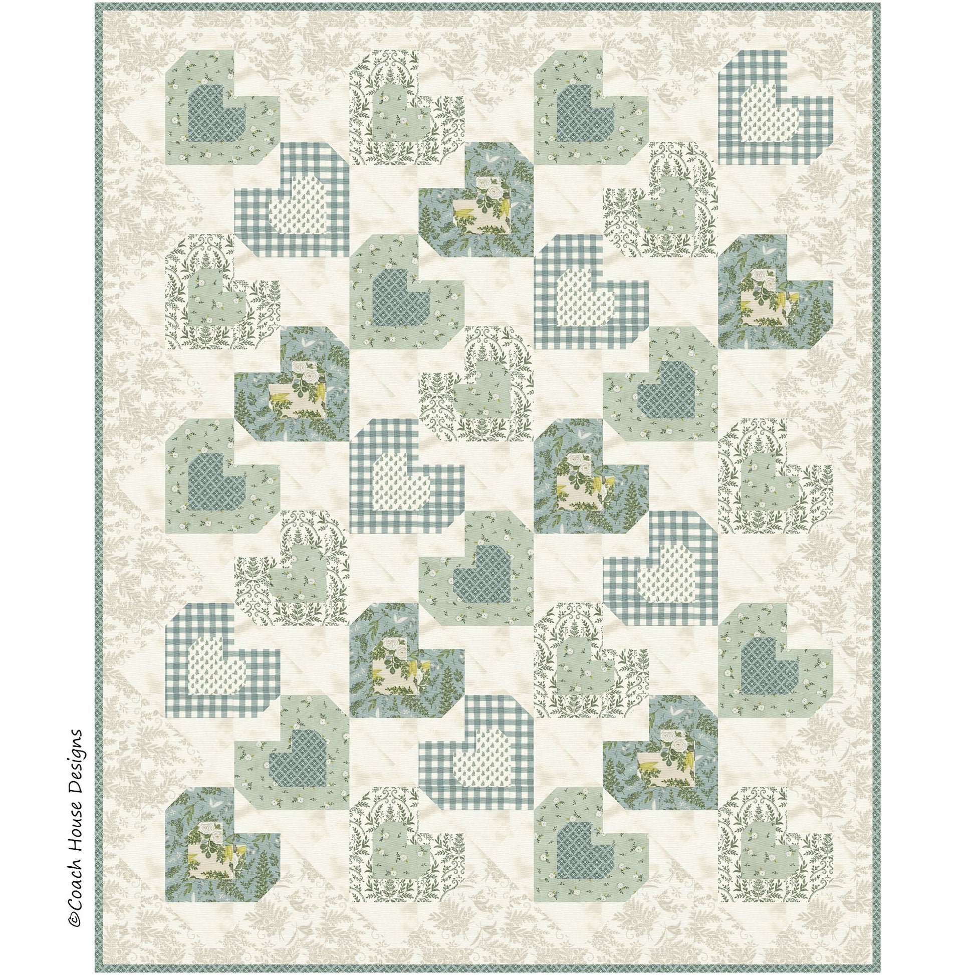 This 47 1/2" x 58 1/2" lap quilt features the fabric line "Happiness Blooms" by Deb Strain for Moda. The simple double heart block is set on point. Perfect quilt for engagement or wedding present!